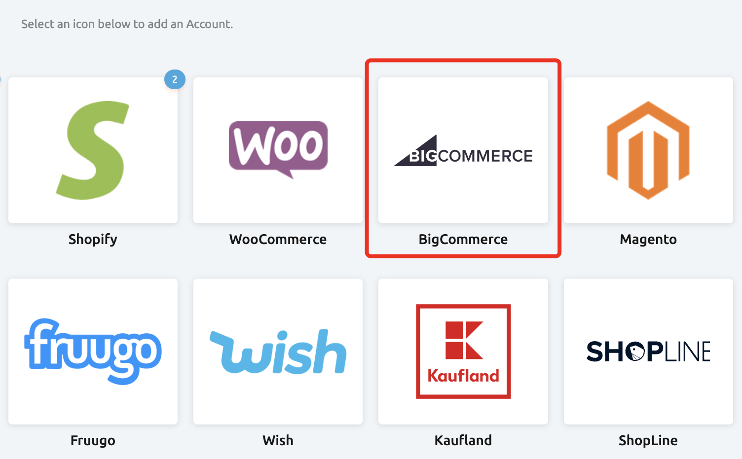 Go to the Admin > Accounts page and click on the newly set up BigCommerce integration.