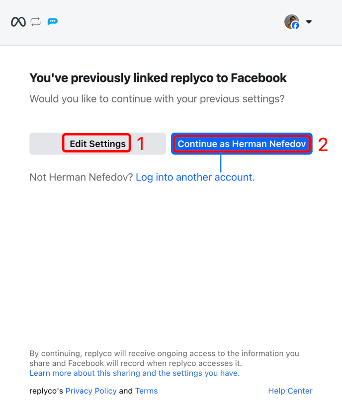 Verify you’re signed into the correct Facebook account for integration, and select Continue as [name] (2). Alternatively, choose Log into another account if needed.