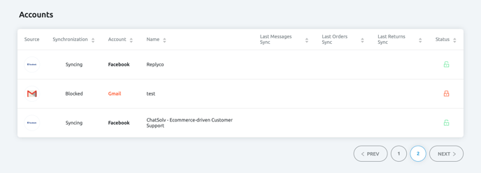 A list will display the Source, Synchronization Status, Account, Name, Date for Last Messages Synced, and Last Orders Synced.