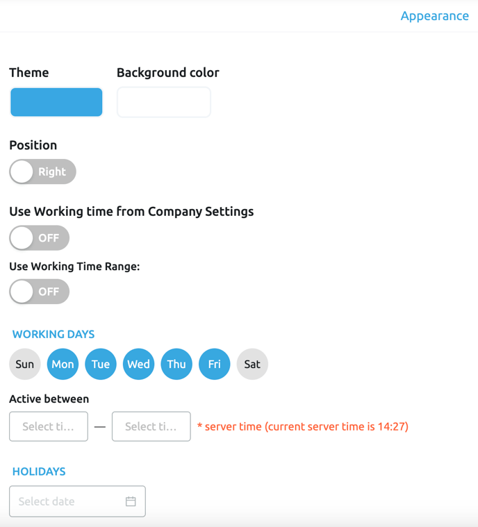 - Working Days / Hours / Holidays: Set your operating hours, which will determine whether web visitors see the “During business hours” or “Outside business hours” message. You may use the working hours from your Company Settings.