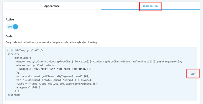 Go to the Installation tab for your newly created widget, and click Copy next to the HTML code.